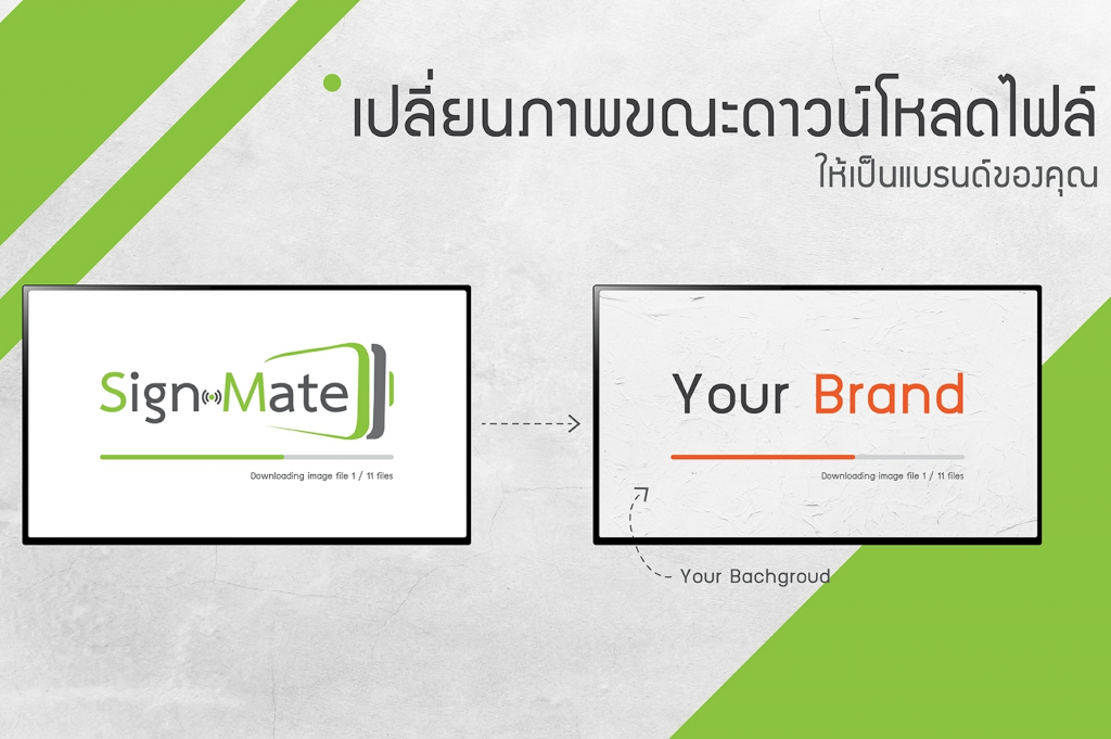 ระบบ SignMate รองรับการทำ Whitelabel เปลี่ยนภาพหน้าจอ Digital Sigange ขณะดาวน์โหลดไฟล์ให้เป็นแบรนด์ของคุณ โดยคุณแค่ออกแบบ Artwork หน้าจอเป็นขนาด Full HD แล้วนำมาแทนที่แบรนด์ของ SignMate เท่านั้น (โดยบริการส่วนนี้จะรองรับตั้งแต่ Package "Corporate" ขึ้นไป)